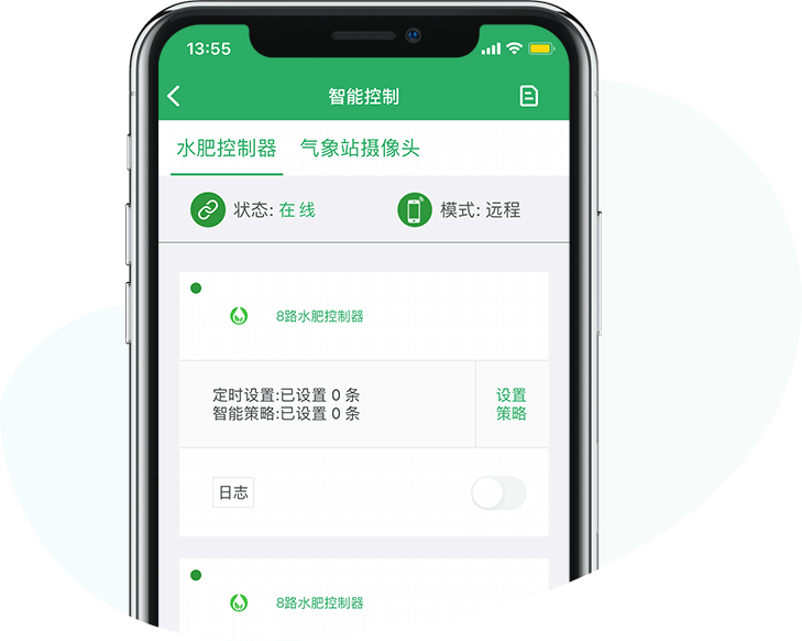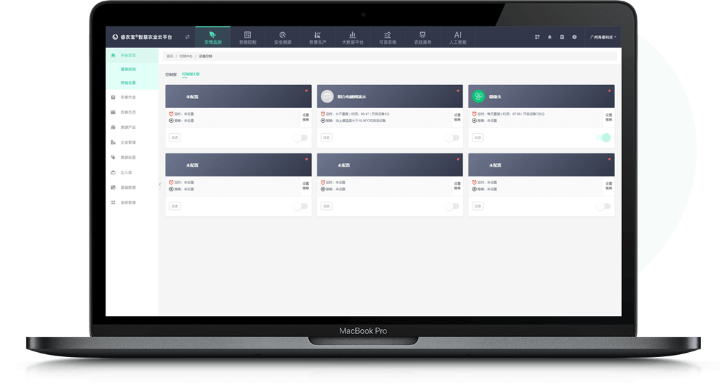 通過睿農寶APP,可以對設備進行遠程控制。同時還可以通過APP設置智能控制策略,可以實現定時、定點的控制設備。結合“睿農寶”環境監測設備,還可以根據現場環境情況進行智能控制。例如當溫度過高時打開風機,當光照不足時打開日光燈等,實現自動化生產管理。